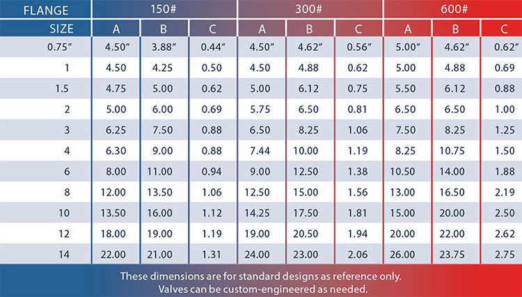 *Basic options Carbon Steel Bodies, Stainless Internal. Other Materials are available. Available by different Pressure Classes. All dimensions are listed in inches. Dimensions shown are for standard design. Valves are custom-engineered and dimensions provided above are for reference only. Dimensions are subject to change without notice.