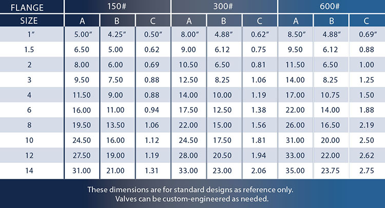 *Basic options Carbon Steel Bodies, Stainless Internal. Other Materials are available. Available by different Pressure Classes. All dimensions are listed in inches. Dimensions shown are for standard design. Valves are custom-engineered and dimensions provided above are for reference only. Dimensions are subject to change without notice.